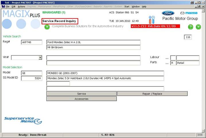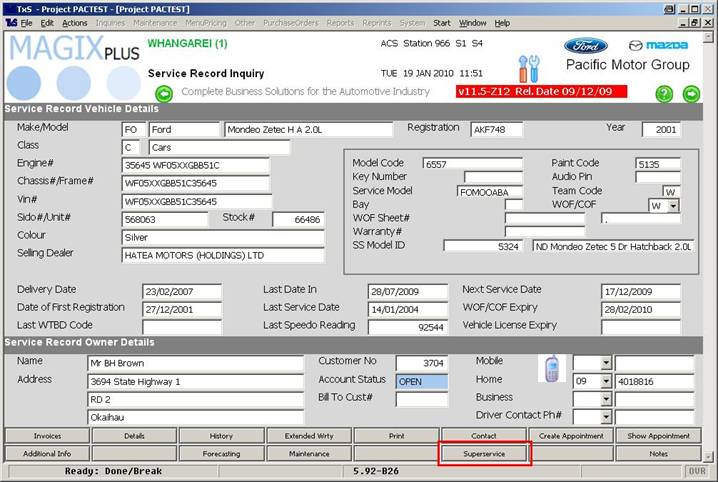 The second method of accessing Lookup is via the Superservice button located in Service Record Inquiry, as indicated in the image below: